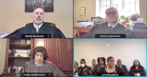 Judge Lyris Younge, lower right, during her sanction hearing in April. Pennsylvania Court of Judicial Discipline